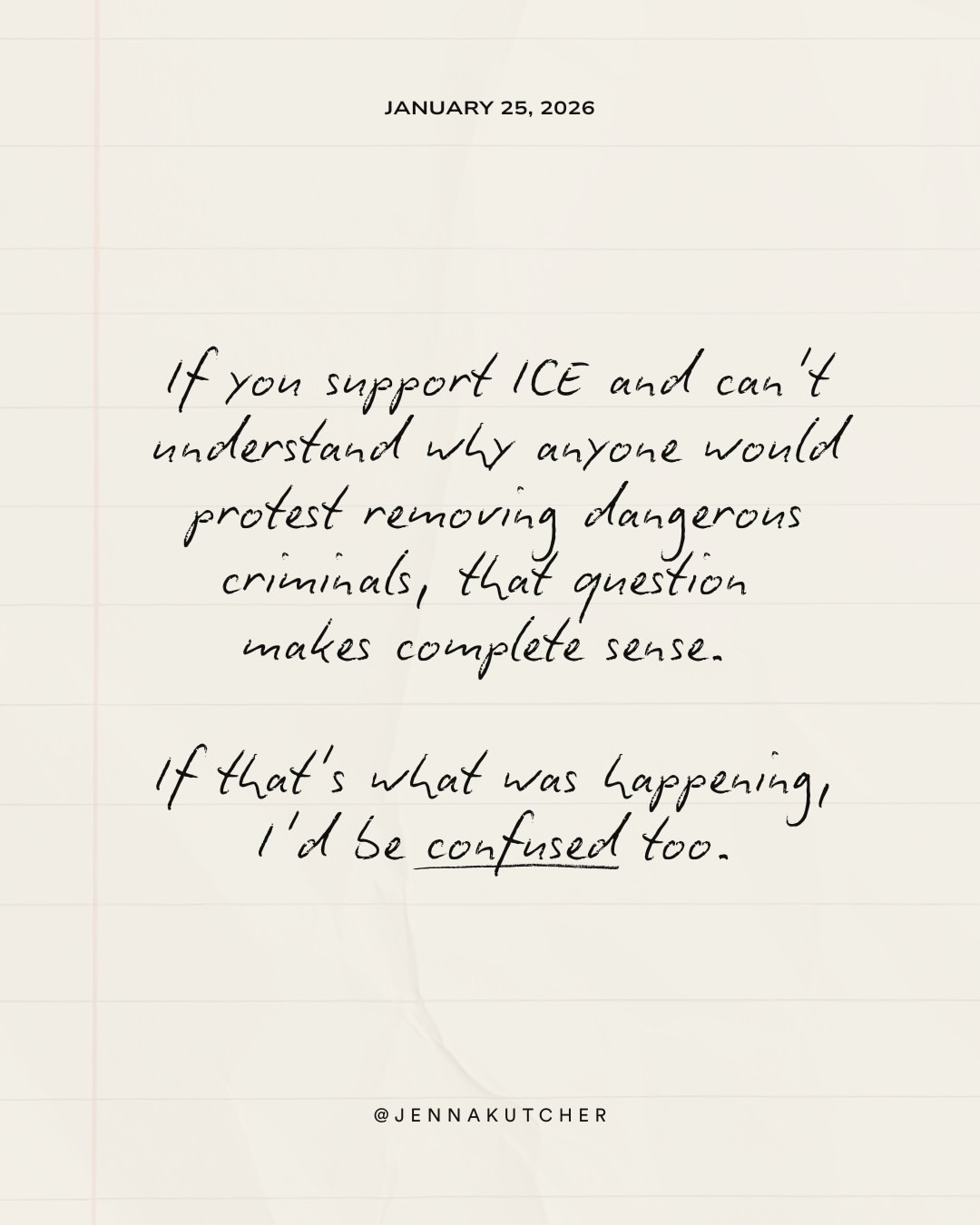 I saw and shared the following from Jenna Kutcher on Instagram yesterday and wanted to share it here too. I deeply appreciate the way in which she clearly states what she understands to be true about ICE, while at the same time choosing not to shame those who see things differently.